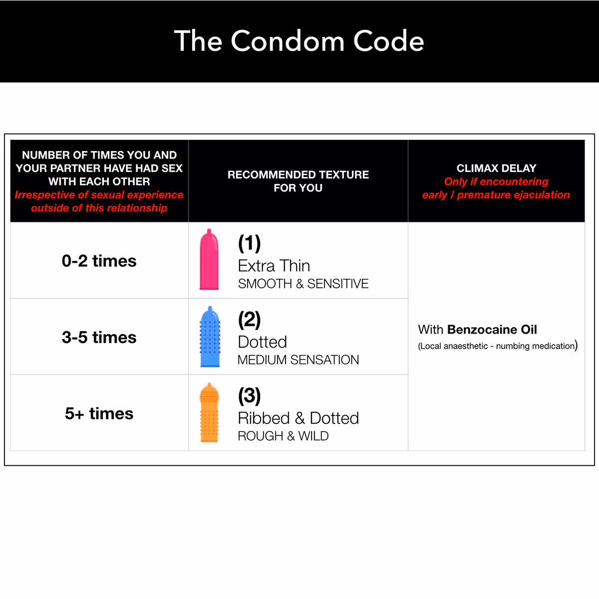 The Condom Code: A tool to help you pick a condom as per texture & your sexual experience with this partner. First timers pick thin, slightly more experienced with this partner, pick dotted, even more experienced pick ribbed & dotted